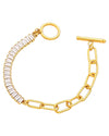 Dieses elegante und charaktervolle Armband besticht durch seinen Kontrast: Funkelnde Zirkonia im Baguetteschliff treffen auf geometrische, markante Glieder und bilden so eine moderne, goldfarbene Komposition. Der Knebelverschluss verleiht dem Armband einen Hauch von schicker Eleganz und hohen Tragekomfort. Perfekt für elegante Outfits und luxuriöse Alltagslooks.