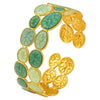 Dieses einzigartige Armband ist von der subtilen Schönheit der Natur inspiriert. Das vergoldete Band ist mit unregelmäßigen, grünen, blattartigen Medaillons verziert – jedes mit einer feinen Textur, die dem Schmuckstück Tiefe und künstlerischen Charakter verleiht.