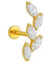 Dieser Ohrring aus 925er Sterlingsilber mit 18-karätiger Vergoldung ist mit fünf kristallklaren Zirkonia im Marquiseschliff besetzt. Ihre Anordnung bildet einen zarten Zweig – voller Strahlkraft, Harmonie und Leichtigkeit. Jeder Stein schimmert in Bewegung, wie ein Tautropfen in der Morgensonne.