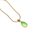 Tauchen Sie ein in die Frische und Harmonie des Grüns. Dieser zarte Tropfen, eingefasst in eine goldene Fassung, erinnert an ein taubedecktes Blatt am Morgen – ein Symbol für Wiedergeburt, Ausgeglichenheit und innere Stärke.