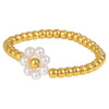 Delikatny pierścionek elastyczny wykonany ze złoconych koralików, ozdobiony uroczym kwiatkiem z perełek.