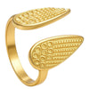 Otwarty pierścionek w formie delikatnych, złotych skrzydeł to wyjątkowy symbol wolności, marzeń i wewnętrznej siły.